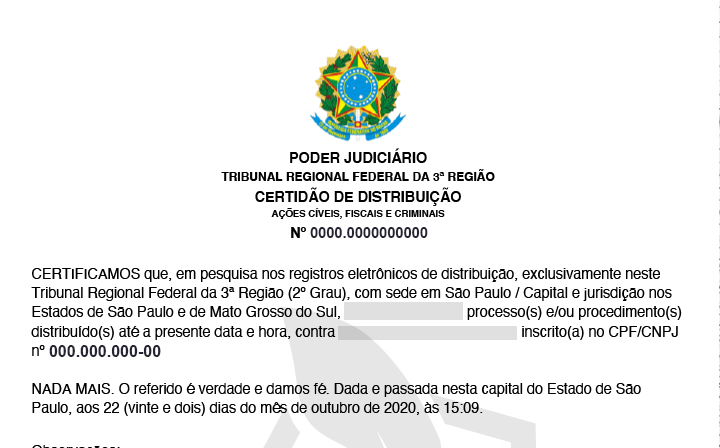 A Certidão de Distribuição da Justiça Federal, também conhecida como Certidão Negativa da Justiça Federal,
