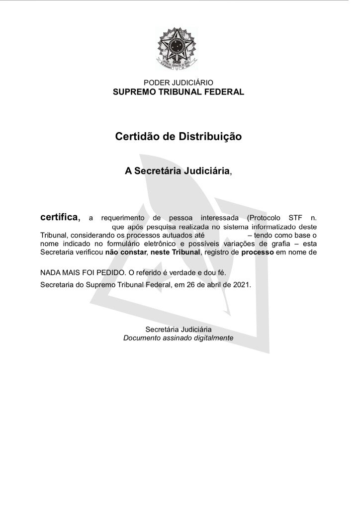 Trata-se de um documento com validade legal sobre a apuração de informações processuais sobre um indivíduo ou empresa. E não pode ser conhecida ou intitulada como nada consta ou como certidão negativa, ela atesta a existência de processos e é emitida pelo Supremo Tribunal Federal.
