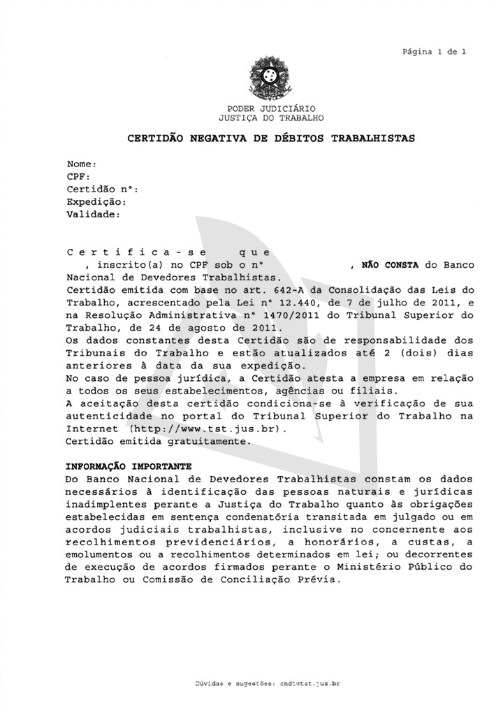 Caso você não possua nenhuma pendência do gênero, poderá emitir uma Certidão Negativa de Débitos Trabalhistas. Isso significa que não existem registros de dívida no nome de sua empresa no Banco Nacional de Devedores Trabalhistas (BNDT).