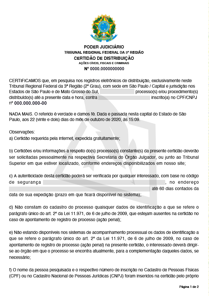 A Certidão de Distribuição da Justiça Federal, também conhecida como Certidão Negativa da Justiça Federal,